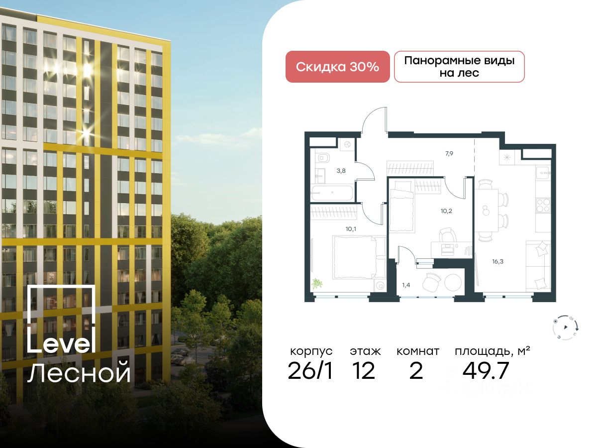 В районе, утопающем в густой зелени лесов, многочисленных парков и скверов, продаётся 2-комнатная квартира площадью 49.70 кв.м с отделкой white box. Квартира расположена на 12 этаже в жилом комплексе комфорт-класса Level Лесной (компания Level Group/Левел групп).