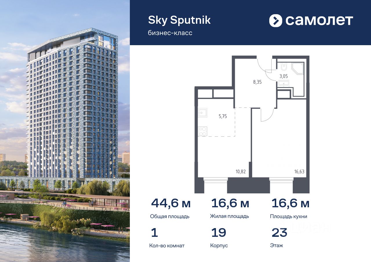 Предлагаются 1-комнатные апартаменты бизнес-класса 44,6 кв.м в корпусе 19 на 23 этаже, в Sky Sputnik Апартаменты без отделки. Доступность опции ''отделка'' и возможность комплектации мебелью и декором уточняйте у застройщика.