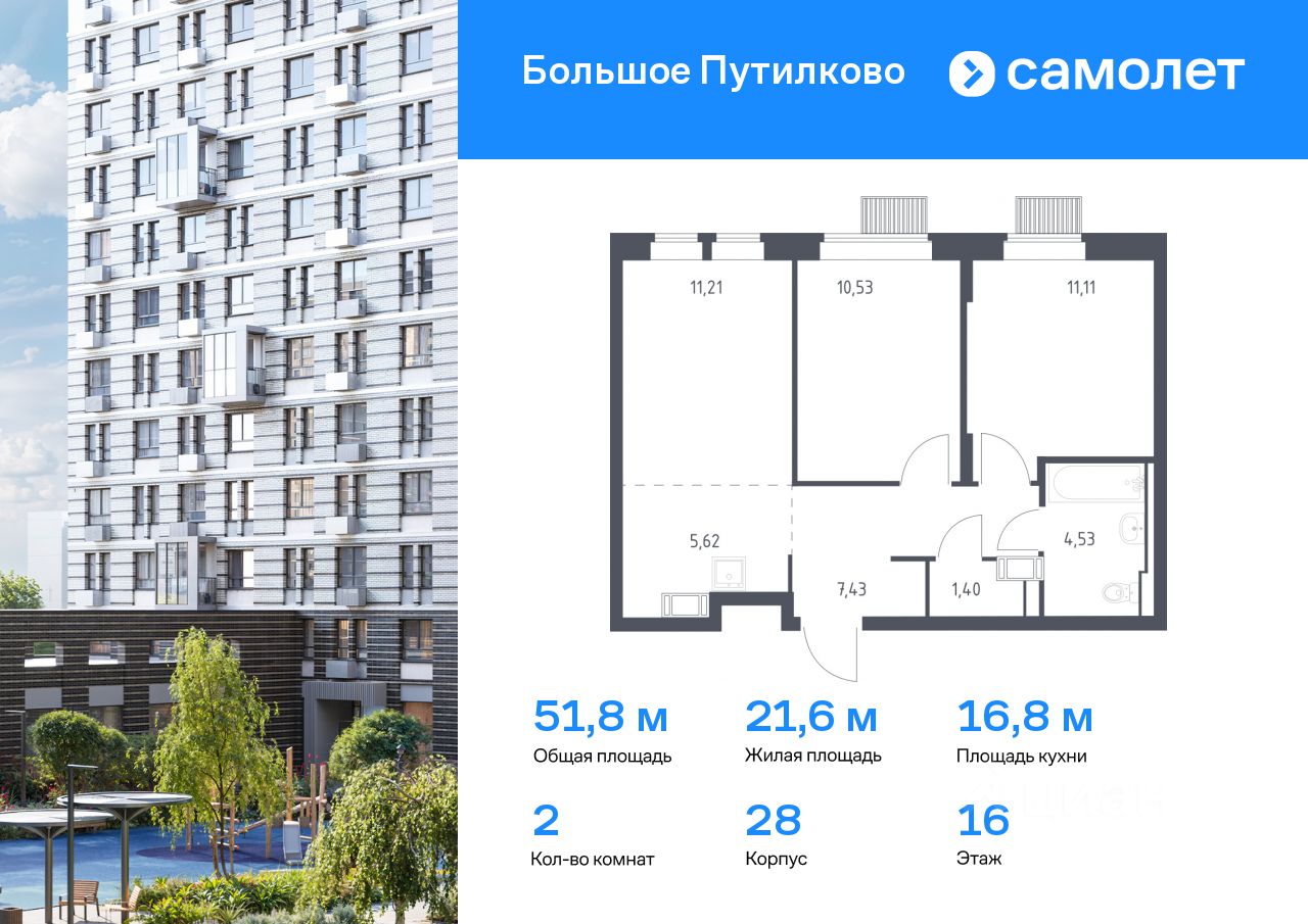 Предлагается 2-комнатная квартира комфорт-класса 51,83 кв.м в корпусе 28 на 16 этаже, в ЖК ''Большое Путилково'' Квартира без отделки. Доступность опции ''отделка'' и возможность комплектации мебелью и декором уточняйте у застройщика.