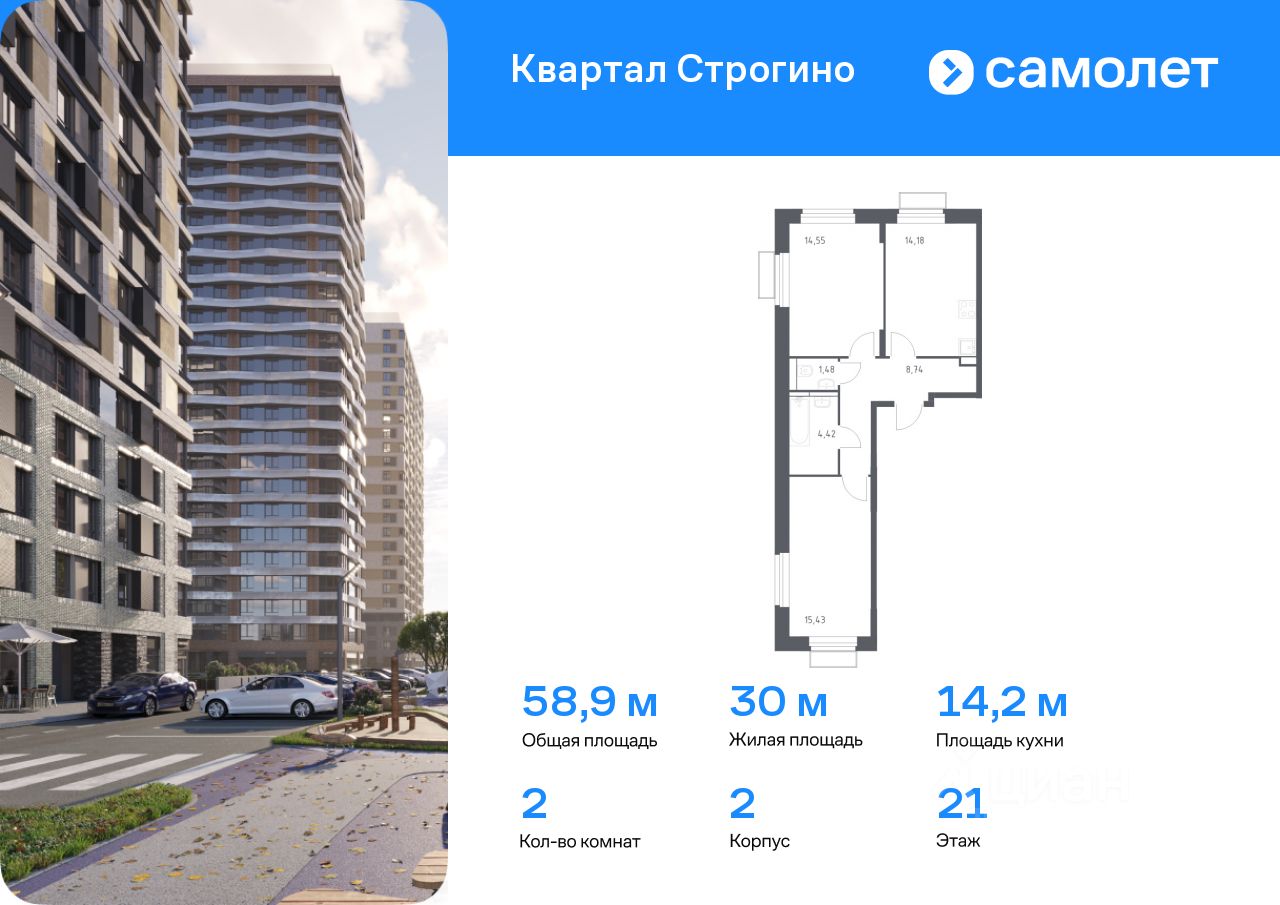 Предлагается 2-комнатная квартира комфорт-класса 58,87 кв.м в корпусе 2 на 21 этаже, в ЖК ''Квартал Строгино'' Квартира без отделки. Доступность опции ''отделка'' и возможность комплектации мебелью и декором уточняйте у застройщика.