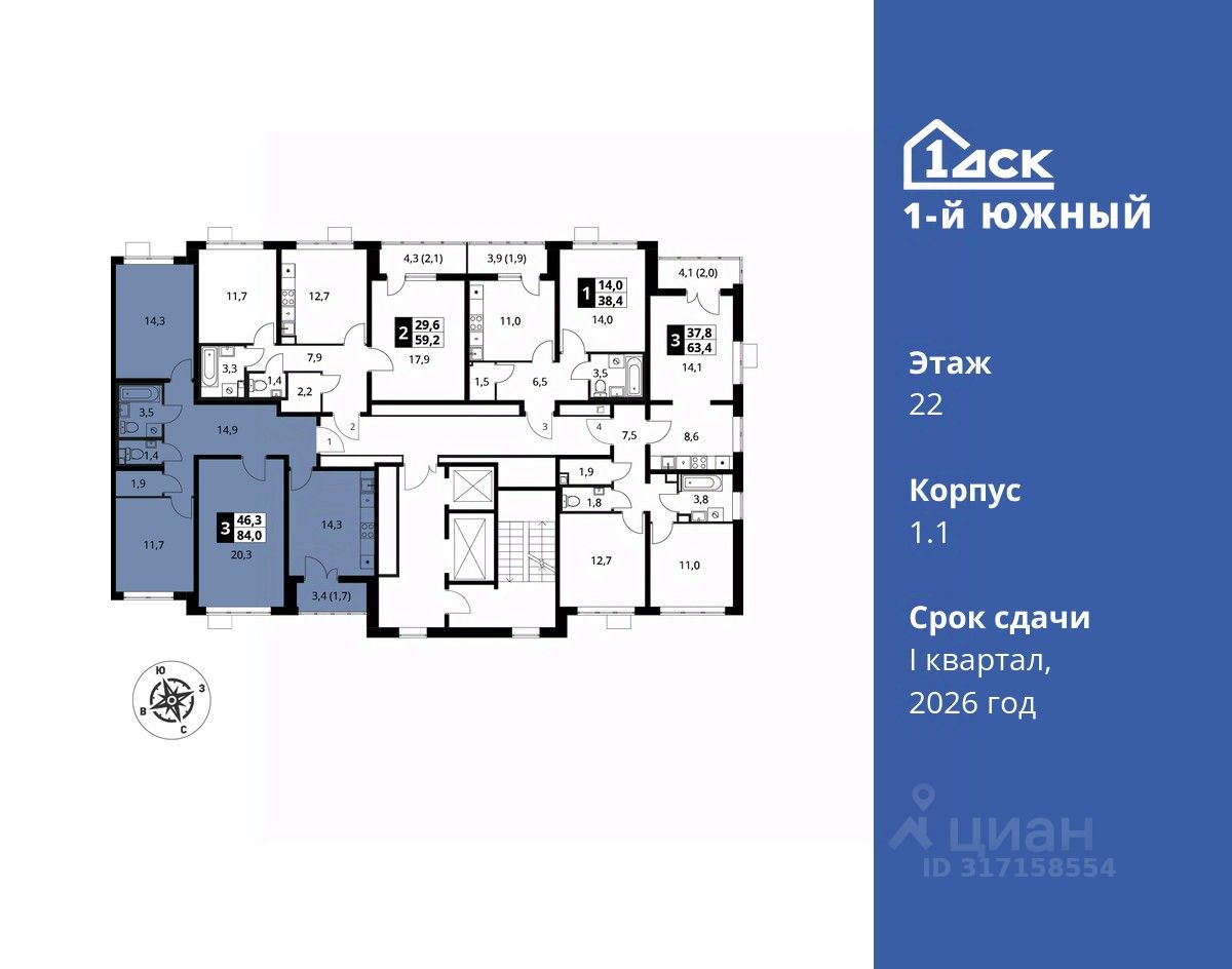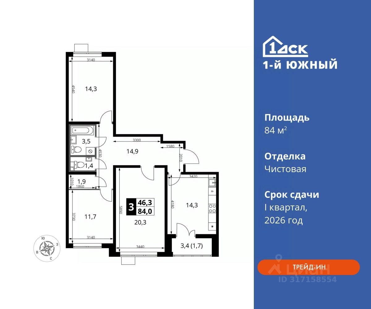 продам 3-к, Первый Южный ЖК, 1.118 176 928 ₽
