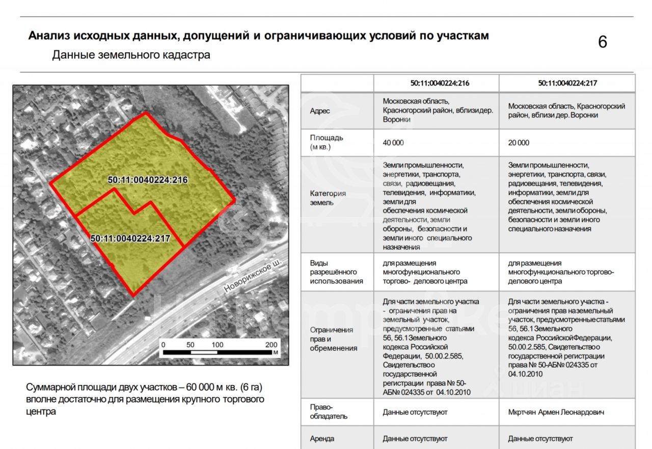 6 га на Новой Риге под застройку ТРЦ ''Рига Фуд-Сити Молл'' Ознакомьтесь с приложенными фото и документами, подтверждающими готовность к началу работ. Для реализации данного варианта проекта существуют следующие условия: Участок земли 6 га в собственности (правая сторона Новорижского шоссе, 6-й км от МКАД Получено разрешение на строительство съезда и выезда к предполагаемому торговому центру Наличие электрических мощностей 1.2 мВт на соседнем участке, возможно увеличение до 35 МВт Сформированная концепция торгового центра, описание ниже Точка врезки канализации (вода, отходы) увеличение Бизнес-модель проекта: 6 га на Новой Риге под застройку ТЦ ''Рига Фуд-Сити Молл'' Вашему вниманию представляется описание земельного участка, на котором предлагается постройка Холодильники-рефрижераторы Площади для приёма Евро-фур для оптовой продажи Подземная парковка на 130 мест Здание до 5 этажей Предварительная оценка доходности ТЦ (предварительно) до 100 млн. руб. / месяц Время строительства - 2 календарных года Предполагаемое время окупаемости проекта - 3-4 года Мини-гостиница Фуд-корт на 15 ресторанов под аренду - 700 мест Парковочная площадка на 1300 мест, торговые площади На данном участке возводится ТЦ ''Рига Фуд-Сити Молл''. Цена продажи земельного участка для данной бизнес-модели - 1.495 млрд. руб