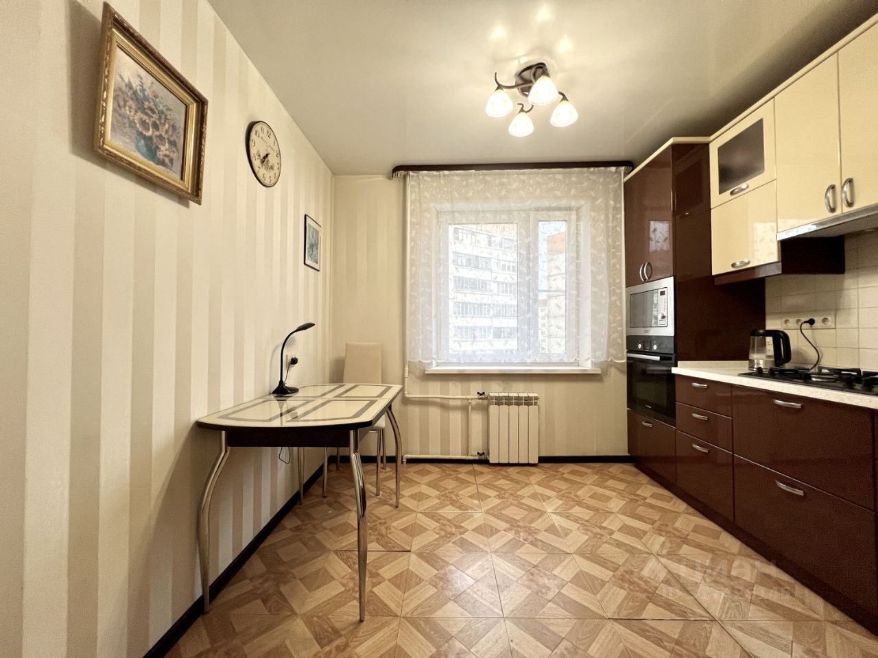 Продаётся светлая, просторная, не требующая вложений, двухкомнатная квартира площадью 52,8 кв. метров с учётом лоджии. Окна выходят на восток, поэтому солнце освещает квартиру утром, а жарким летом нет палящего зноя. Кухня 9 кв. метров оборудована мебельным гарнитуром со встроенной качественной техникой: газовая плита, вытяжка, микроволновка, духовка. Гарнитур изготавливался полностью под заказ по индивидуальному дизайн-проекту. Столешница - натуральный цельный гранит. В комнате 12 кв. метров угловой шкаф, изготовленный по индивидуальному проекту, большой двухспальный диван, стенка под телевизор с полками, комод. Комната 17 кв. метров с выходом на благоустроенную лоджию 3 кв. метра. Вместительный шкаф для хранения одежды и вещей, мебельная стенка и рабочий стол.