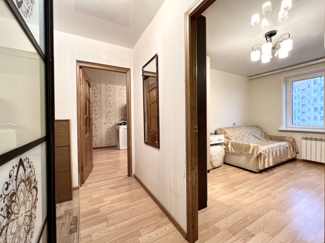 Продаётся светлая, просторная, не требующая вложений, двухкомнатная квартира площадью 52,8 кв. метров с учётом лоджии. Окна выходят на восток, поэтому солнце освещает квартиру утром, а жарким летом нет палящего зноя. Кухня 9 кв. метров оборудована мебельным гарнитуром со встроенной качественной техникой: газовая плита, вытяжка, микроволновка, духовка. Гарнитур изготавливался полностью под заказ по индивидуальному дизайн-проекту. Столешница - натуральный цельный гранит. В комнате 12 кв. метров угловой шкаф, изготовленный по индивидуальному проекту, большой двухспальный диван, стенка под телевизор с полками, комод. Комната 17 кв. метров с выходом на благоустроенную лоджию 3 кв. метра. Вместительный шкаф для хранения одежды и вещей, мебельная стенка и рабочий стол. Лоджия оборудована двумя небольшими деревянными шкафчиками-подсобками для хранения вещей или продуктов. Санузел раздельный. Стиральная машинка, полотенцесушитель. В коридоре два огромных шкафа-купе, обувница. Вся указанная мебель и техника остаются новым собственникам.