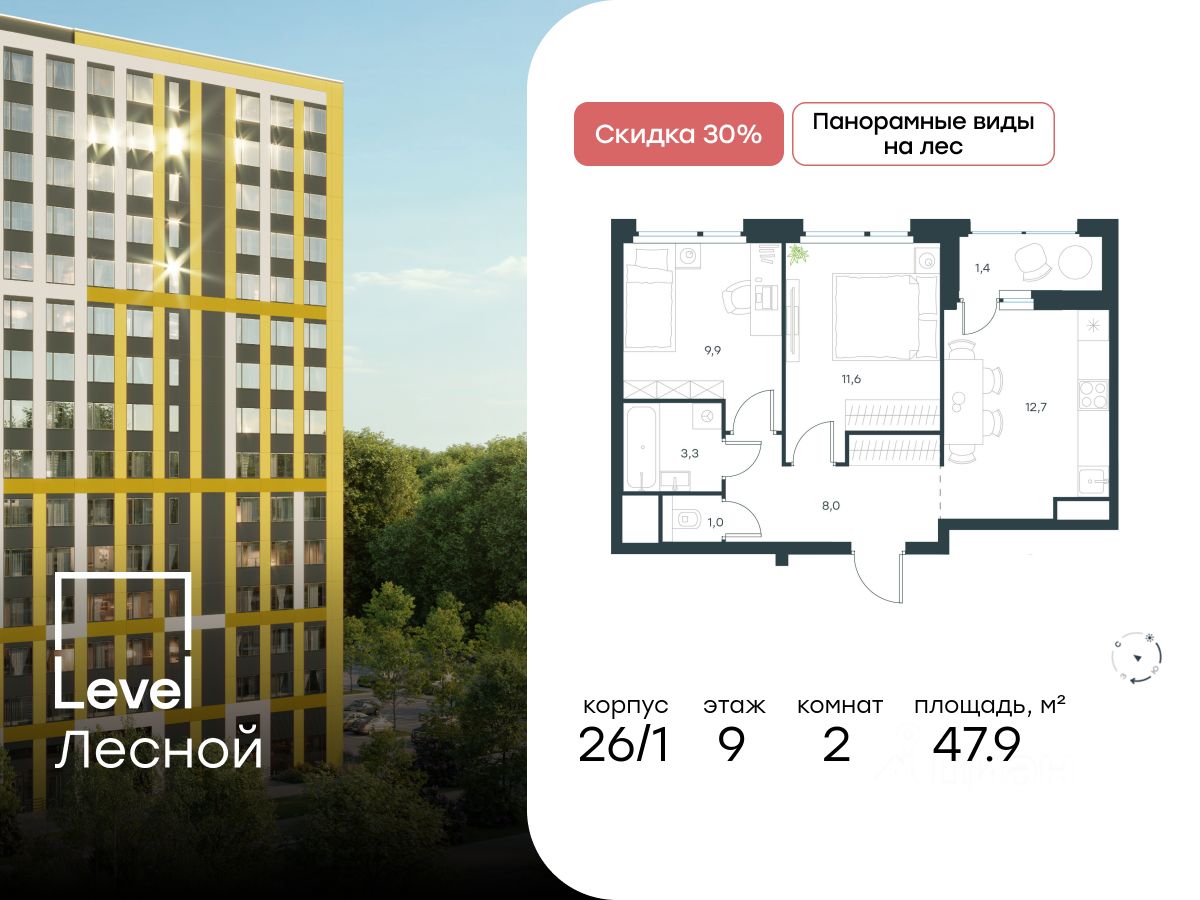 В районе, утопающем в густой зелени лесов, многочисленных парков и скверов, продаётся 2-комнатная квартира площадью 47.90 кв.м с отделкой white box. Квартира расположена на 9 этаже в жилом комплексе комфорт-класса Level Лесной (компания Level Group/Левел групп).