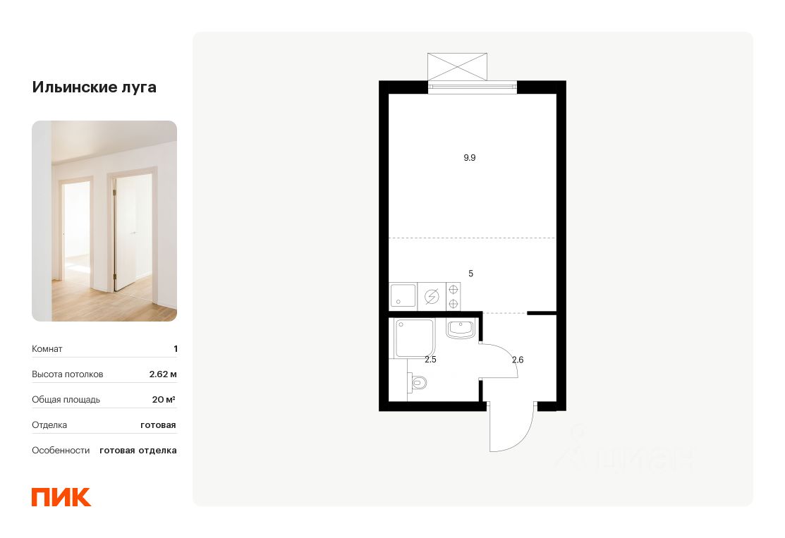 Продаётся квартира-студия площадью 20 кв.м на 5 этаже 9 этажного дома (Корпус 2.9, Секция 4) проекта ПИК Ильинские луга. Светлый просторный подъезд на уровне земли, функциональная планировка, большие окна, c отделкой.