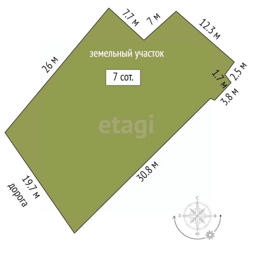 Кроме того, на участке площадью 7 соток доступны все необходимые коммуникации: центральное водоснабжение, электричество 15 кВт и газ.