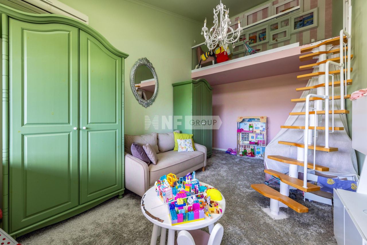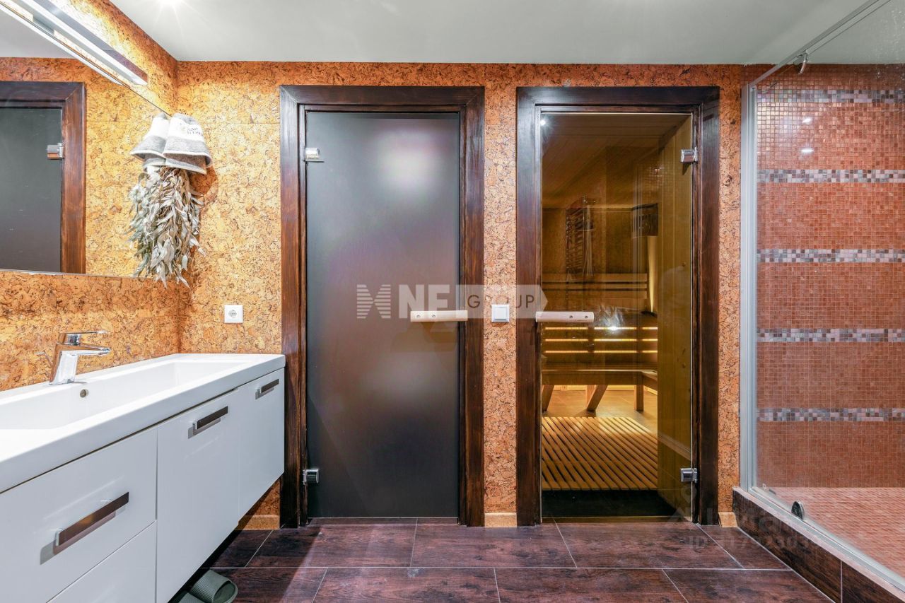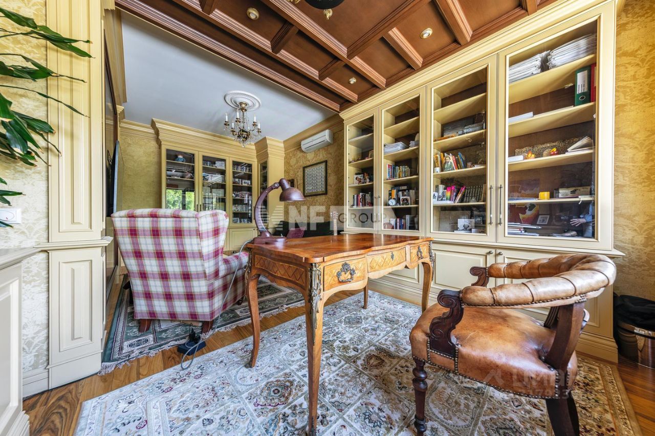 В цокольном этаже — личное пространство в духе private wellness: СПА-зона с сауной Harvia и душем, просторная гардеробная для сезонного хранения, постирочная с техникой Miele, а также универсальное помещение, которое легко превратить в спортивный зал, домашний кинотеатр или студию. Первый этаж — это открытое общее пространство с гостиной и кухней, выполненной по индивидуальному проекту. Немецкое оборудование Ligron, техника Siemens, ASKO, Liebherr, обеденная группа BoConcept, антикварные предметы мебели 1819 века, бронзовые люстры ручной работы и библиотека, созданная на заказ, формируют утонченный интерьер. На втором этаже — приватная зона. Мастер-спальня с ванной комнатой и гардеробной и отдельный блок для детей: две спальни, вместительная гардеробная, санузел. Мансарда — легкое, свободное пространство. Здесь легко представить себе детскую зону, студию или лаунж-гостиную для вечерних разговоров. Предусмотрен дополнительный санузел.