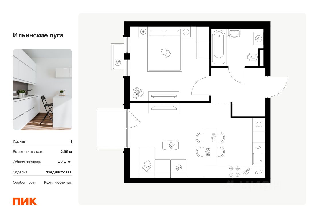 Продаётся 1-комн. квартира площадью 42,4 кв.м на 4 этаже 9 этажного дома (Корпус 3.1, Секция 4) проекта ПИК Ильинские луга. Светлый просторный подъезд на уровне земли, функциональная планировка, большие окна, предчистовая отделка.