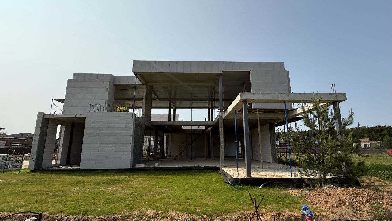 Участок — 8.6 соток, один из лучших по расположению в проекте. Дом — 550 м² (жилая — 430 м²), панорамное остекление — 150 м², потолки до 4.1 м, второй свет — 37 м². Монолит и стены готовы, идут фасадные работы и остекление.