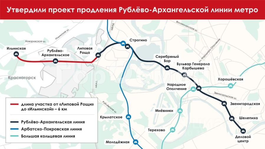 Метро в Красногорске откроют в рамках строительства Рублево-Архангельской линии. Предполагается, что первые станции этой линии, включая те, что будут находиться в Красногорске, откроются в конце 2026 года. Станция ''Ильинская'' в Красногорске, которая станет первой станцией метро в городе, планируется к открытию в 1-2 квартале 2028 года. В дальнейшем линия будет продлена до станций ''Красногорск-1'' и ''Красногорск-2'', открытие которых ожидается в 2031 году.