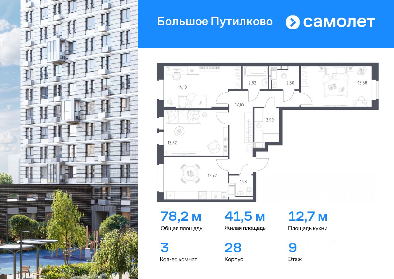 Предлагается 3-комнатная квартира комфорт-класса 78,15 кв.м в корпусе 28 на 9 этаже, в ЖК ''Большое Путилково'' Квартира с чистовой отделкой. Доступность дополнительных опций уточняйте у застройщика.