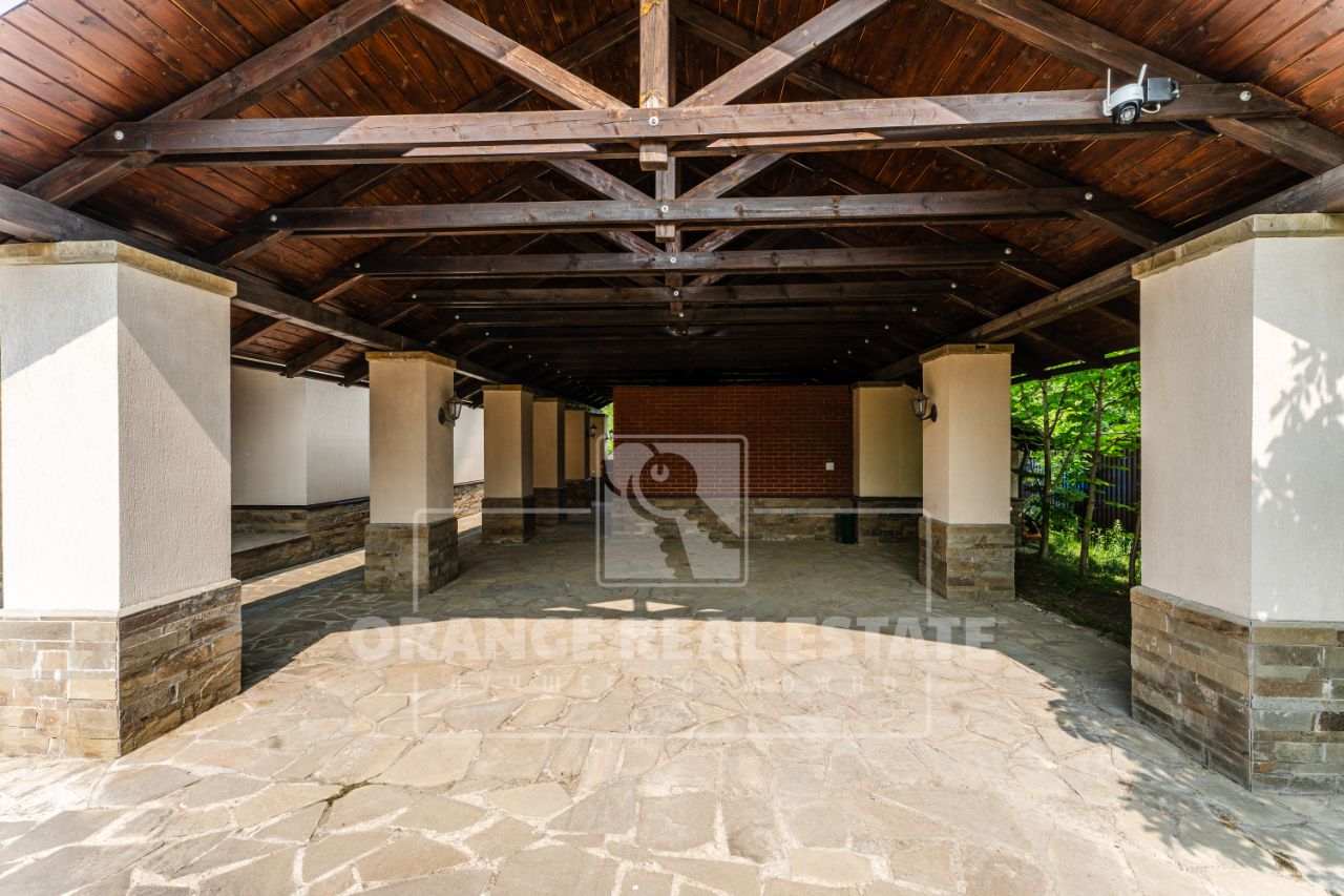 На просторном участке обустроена беседка с барбекю, навес на два автомобиля, детская площадка.