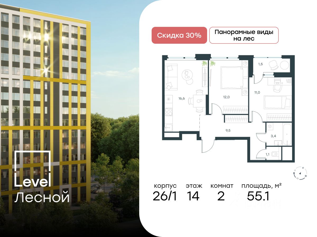 В районе, утопающем в густой зелени лесов, многочисленных парков и скверов, продаётся 2-комнатная квартира площадью 55.10 кв.м с отделкой white box. Квартира расположена на 14 этаже в жилом комплексе комфорт-класса Level Лесной (компания Level Group/Левел групп).