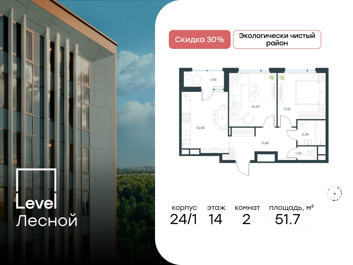 В районе, утопающем в густой зелени лесов, многочисленных парков и скверов, продаётся 2-комнатная квартира площадью 51.70 кв.м без отделки. Квартира расположена на 14 этаже в жилом комплексе комфорт-класса Level Лесной (компания Level Group/Левел групп).