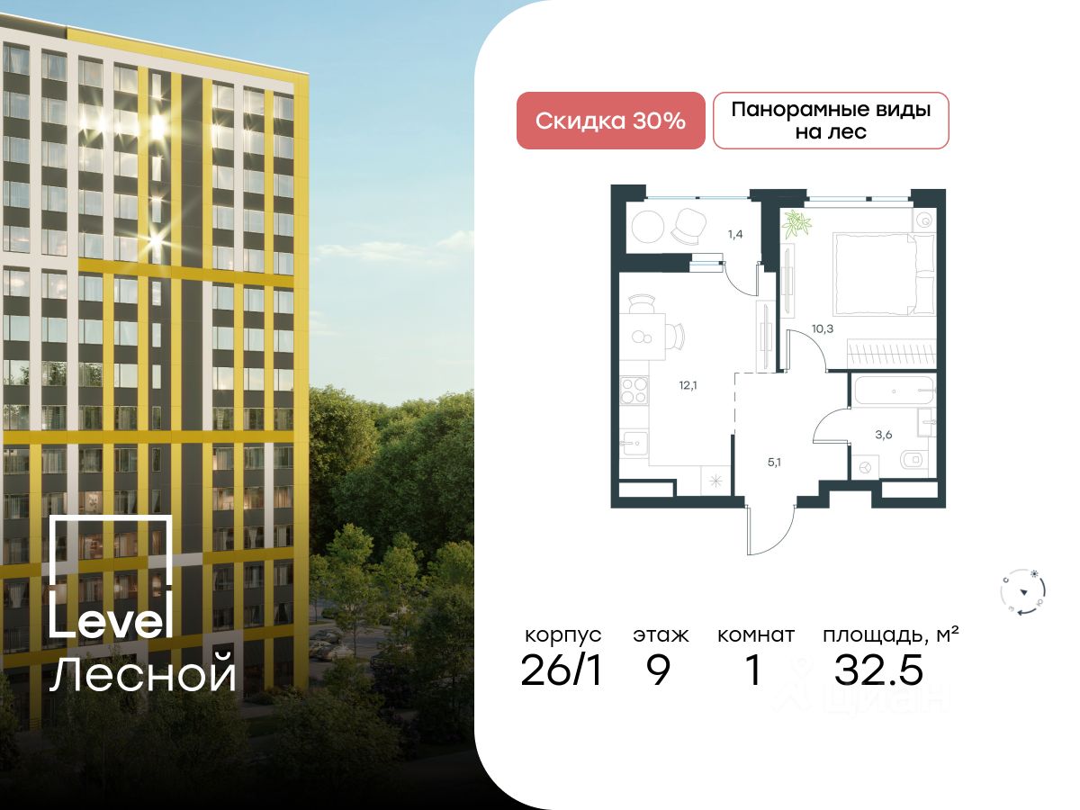 В районе, утопающем в густой зелени лесов, многочисленных парков и скверов, продаётся 1-комнатная квартира площадью 32.50 кв.м с отделкой white box. Квартира расположена на 9 этаже в жилом комплексе комфорт-класса Level Лесной (компания Level Group/Левел групп).