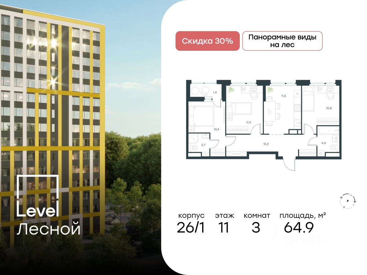В районе, утопающем в густой зелени лесов, многочисленных парков и скверов, продаётся 3-комнатная квартира площадью 64.90 кв.м с отделкой white box. Квартира расположена на 11 этаже в жилом комплексе комфорт-класса Level Лесной (компания Level Group/Левел групп).