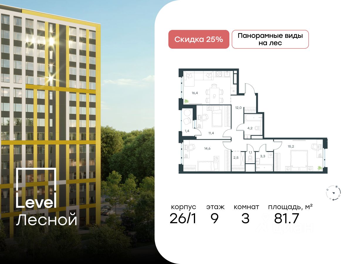 В районе, утопающем в густой зелени лесов, многочисленных парков и скверов, продаётся 3-комнатная квартира площадью 81.70 кв.м с отделкой white box. Квартира расположена на 9 этаже в жилом комплексе комфорт-класса Level Лесной (компания Level Group/Левел групп).