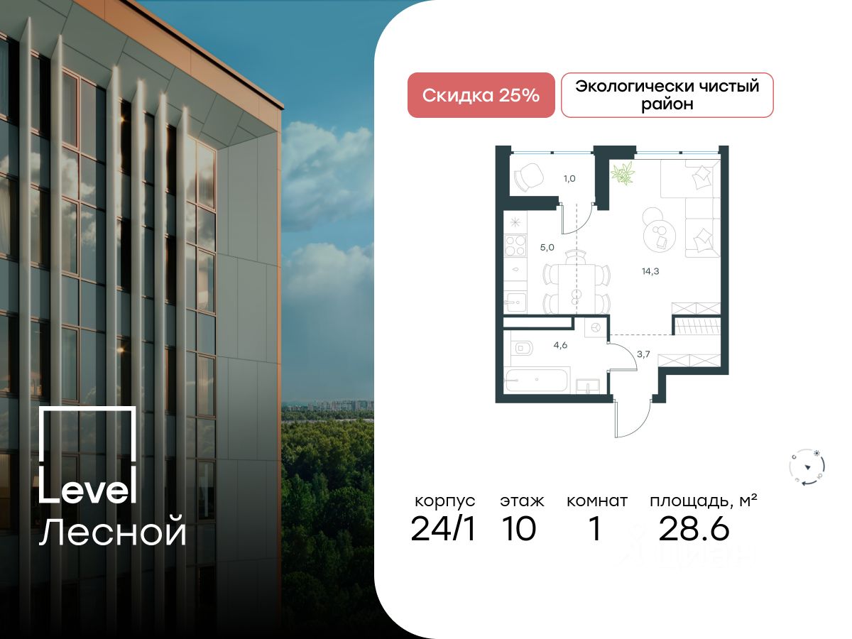 продам 1-к, Левел Лесной ЖК, 24/17 122 102 ₽