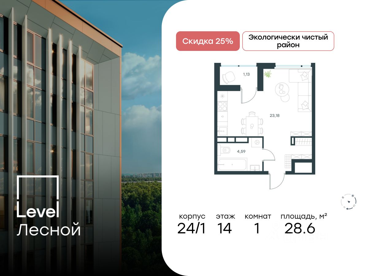 В районе, утопающем в густой зелени лесов, многочисленных парков и скверов, продаётся студия площадью 28.60 кв.м без отделки. Квартира расположена на 14 этаже в жилом комплексе комфорт-класса Level Лесной (компания Level Group/Левел групп).