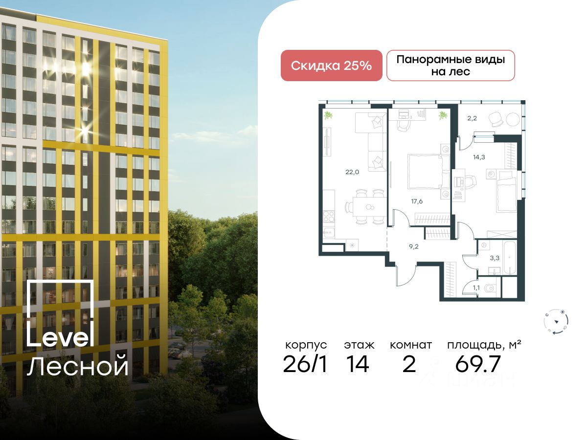 В районе, утопающем в густой зелени лесов, многочисленных парков и скверов, продаётся 2-комнатная квартира площадью 69.70 кв.м с отделкой white box. Квартира расположена на 14 этаже в жилом комплексе комфорт-класса Level Лесной (компания Level Group/Левел групп).
