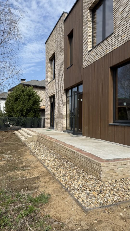 Дом построен из керамического блока Porotherm, толщина блока 44 см. Фасад облицован кирпичом ручной формовки из натуральной керамики. Окна алюминиевые ALUTECH.