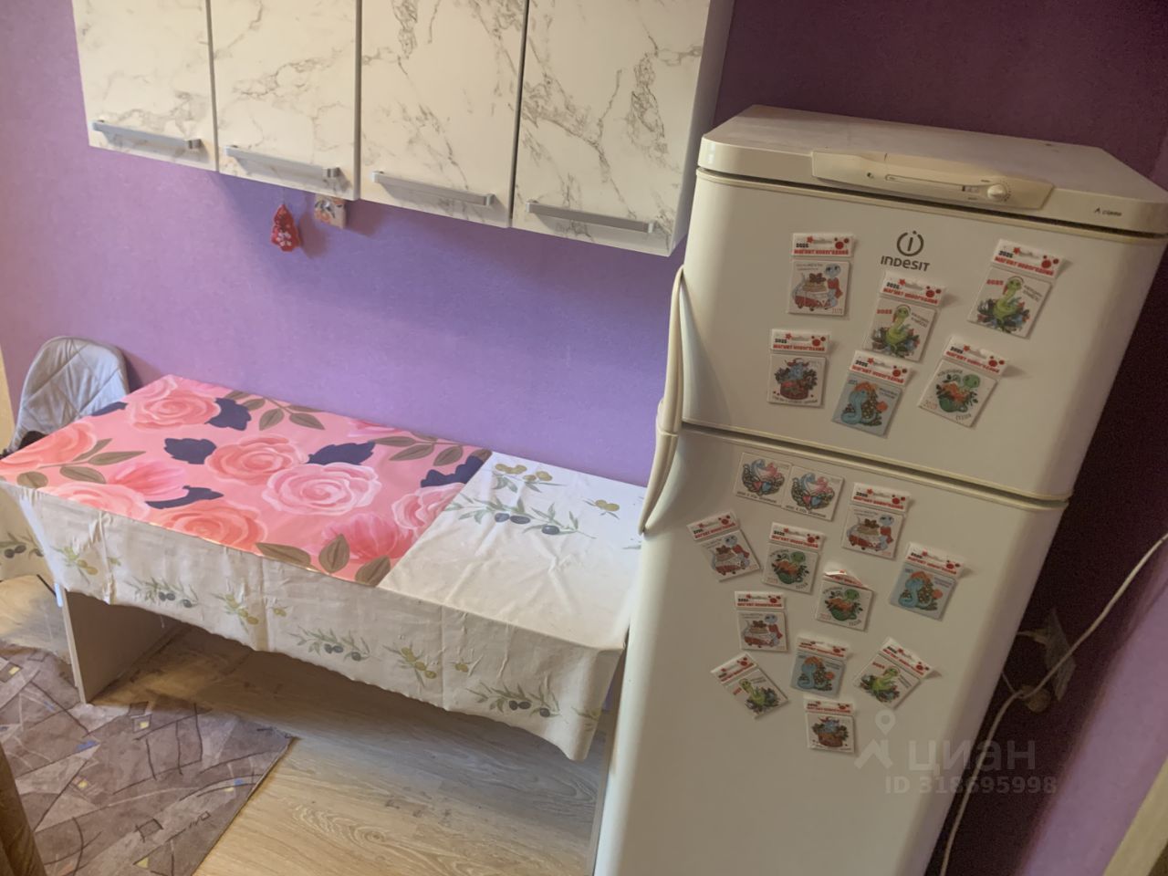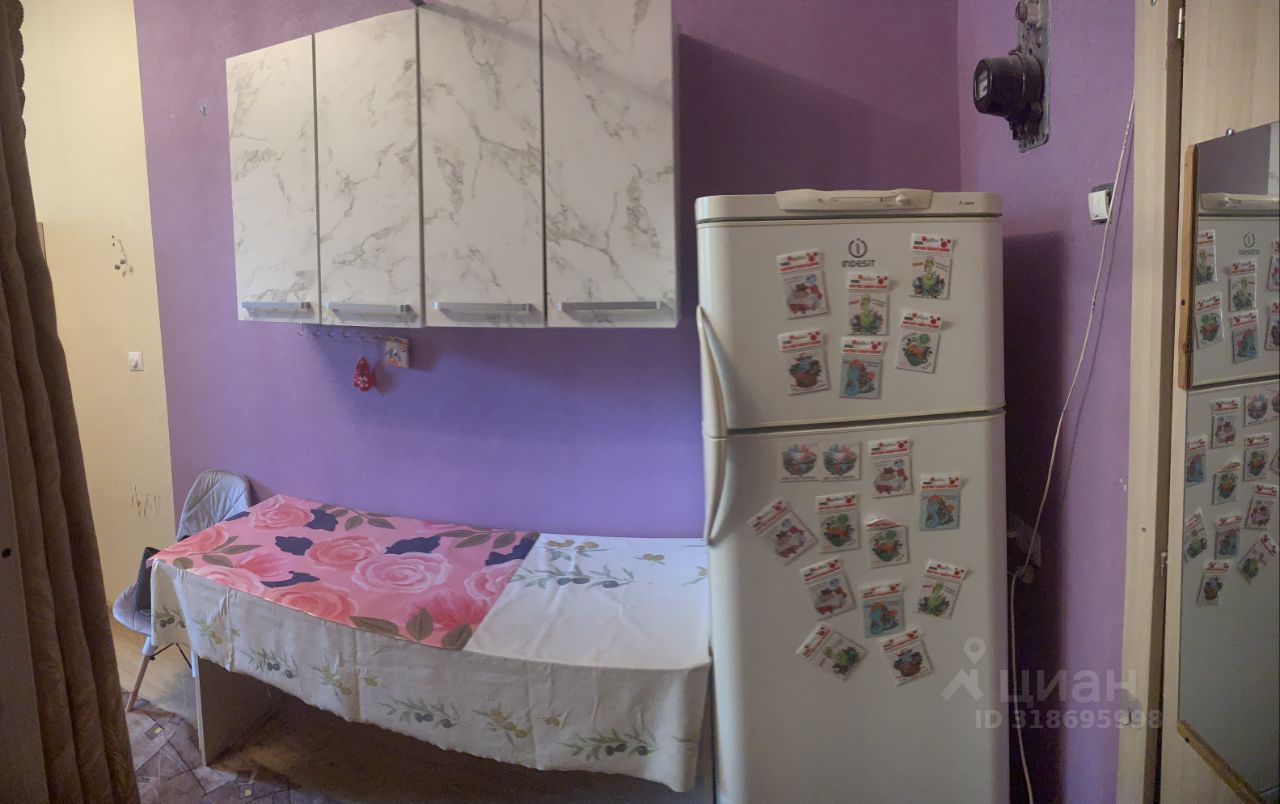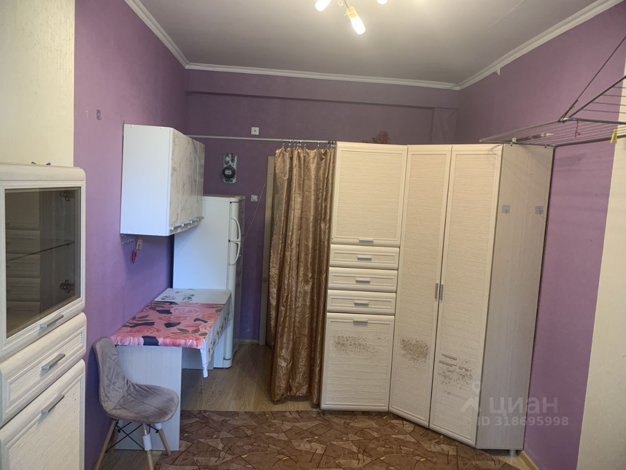В комнате есть большой диван, стенка, шкаф, холодильник, стол кухонный, стул, прихожая.