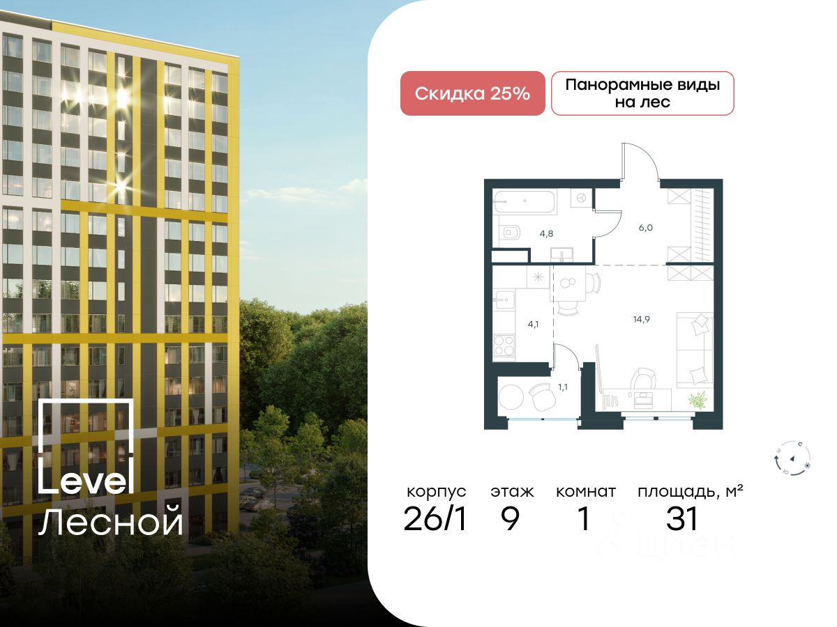 В районе, утопающем в густой зелени лесов, многочисленных парков и скверов, продаётся студия площадью 31.00 кв.м с отделкой white box. Квартира расположена на 9 этаже в жилом комплексе комфорт-класса Level Лесной (компания Level Group/Левел групп).