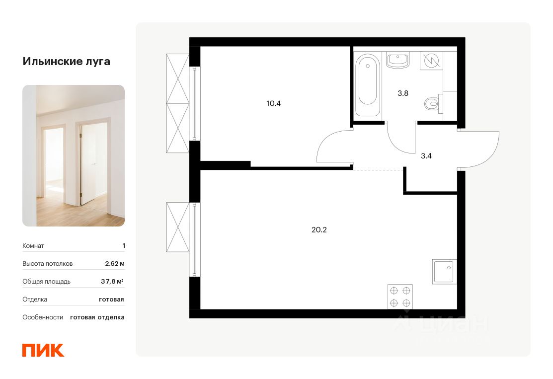 Продаётся 1-комн. квартира площадью 37,8 кв.м на 7 этаже 9 этажного дома (Корпус 2.8, Секция 4) проекта ПИК Ильинские луга. Светлый просторный подъезд на уровне земли, функциональная планировка, большие окна, c отделкой.