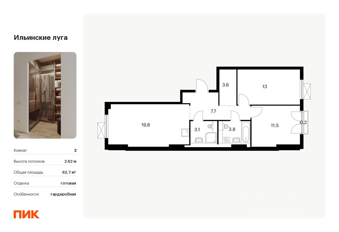 Продаётся 2-комн. квартира площадью 62,7 кв.м на 8 этаже 9 этажного дома (Корпус 2.8, Секция 4) проекта ПИК Ильинские луга. Светлый просторный подъезд на уровне земли, функциональная планировка, большие окна, c отделкой.