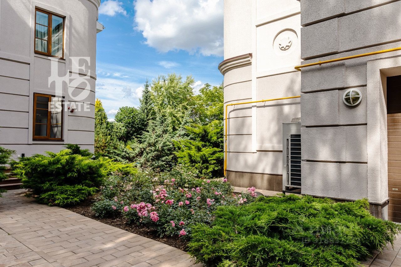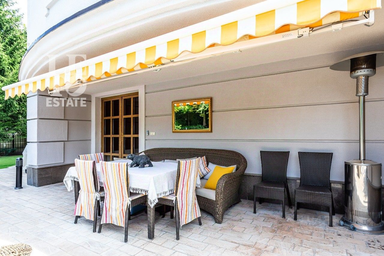 Участок площадью 19 соток прямоугольной формы. На участке проведены ландшафтные работы, по периметру растут ели и сосны, есть зона отдыха с уличным бассейном (длина 12м) и патио с маркизой. В поселке есть все центральные коммуникации (электричество, водоснабжение, канализация, газ). На территории построен отдельностоящий двухэтажный хозблок площадью 105 кв. м в общей стилистике с домом, в котором есть несколько комнат для персонала.