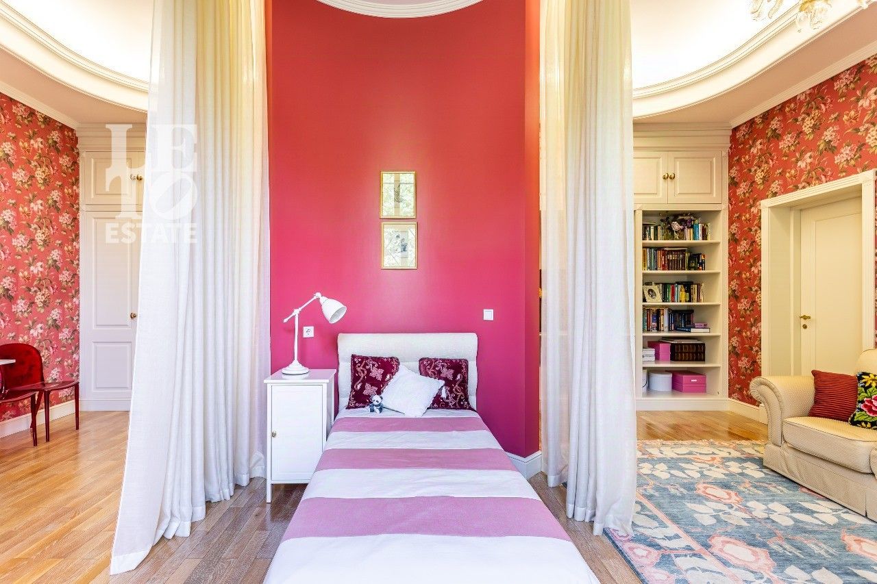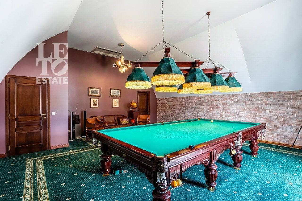 Планировка: Первый этаж - парадный холл с лифтом, гостиная, каминный зал, кухня-столовая, санузел, гараж на два машиноместа. На втором этаже: 4 спальни с ванными комнатами и 3 санузлами, библиотека. На третьем этаже: кабинет, бильярдная с санузлом.