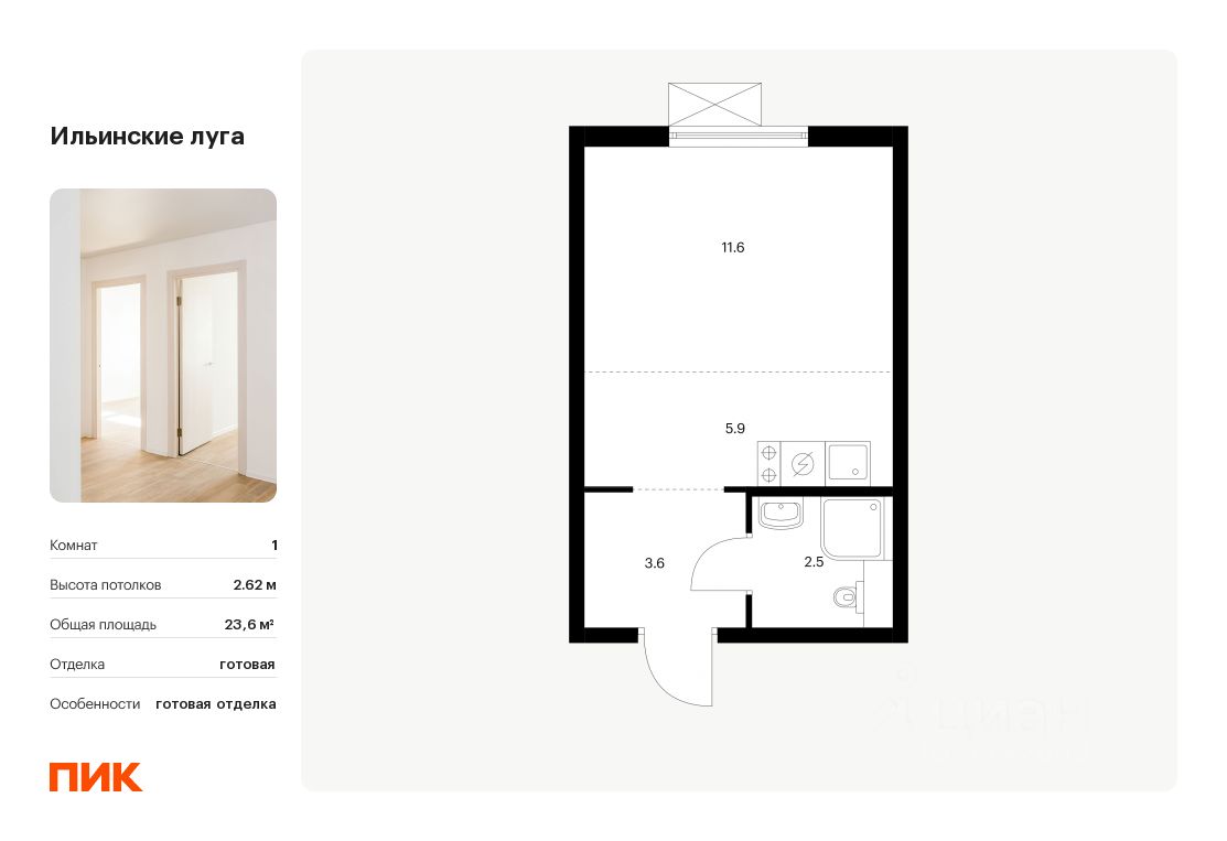 Продаётся квартира-студия площадью 23,6 кв.м на 8 этаже 9 этажного дома (Корпус 2.9, Секция 4) проекта ПИК Ильинские луга. Светлый просторный подъезд на уровне земли, функциональная планировка, большие окна, c отделкой.