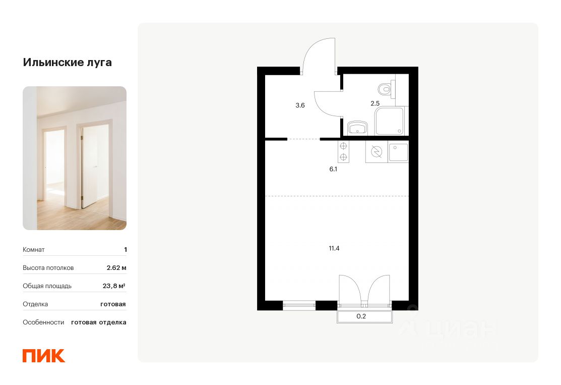 Продаётся квартира-студия площадью 23,8 кв.м на 8 этаже 9 этажного дома (Корпус 2.8, Секция 2) проекта ПИК Ильинские луга. Светлый просторный подъезд на уровне земли, функциональная планировка, большие окна, c отделкой.