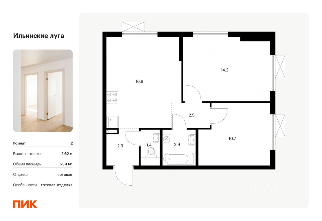 Продаётся 2-комн. квартира площадью 51,4 кв.м на 3 этаже 9 этажного дома (Корпус 2.13, Секция 3) проекта ПИК Ильинские луга. Светлый просторный подъезд на уровне земли, функциональная планировка, большие окна, c отделкой.