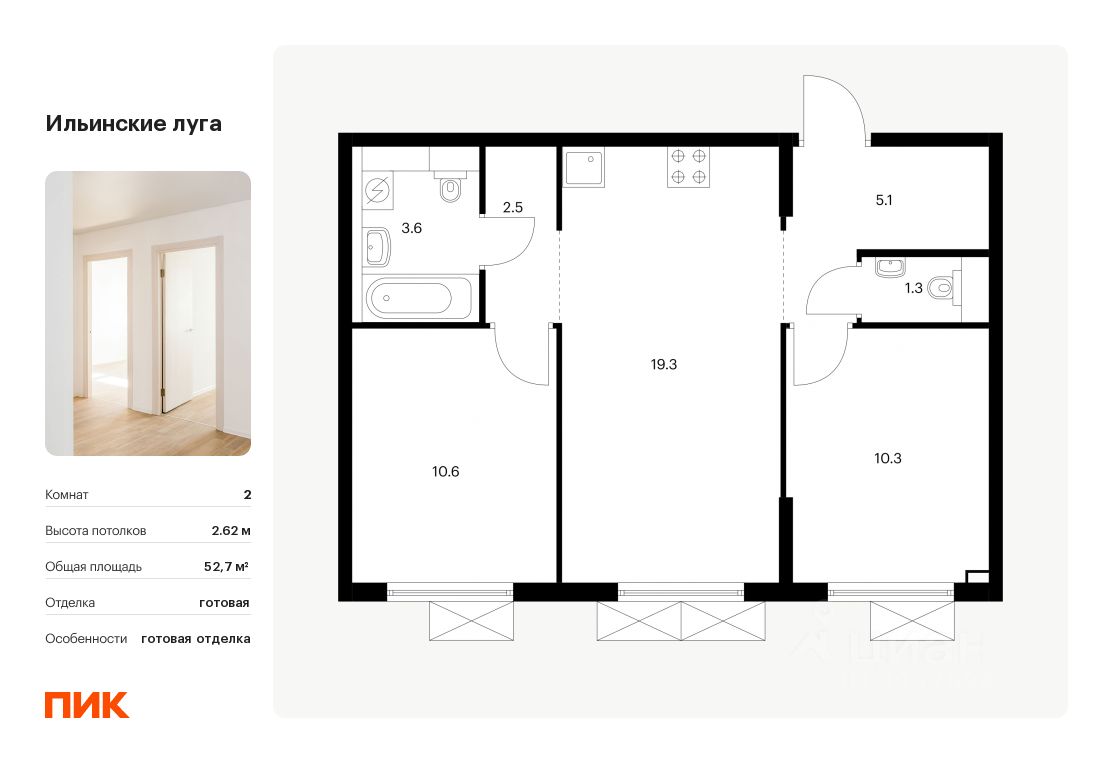 Продаётся 2-комн. квартира площадью 52,7 кв.м на 6 этаже 9 этажного дома (Корпус 2.9, Секция 3) проекта ПИК Ильинские луга. Светлый просторный подъезд на уровне земли, функциональная планировка, большие окна, c отделкой.