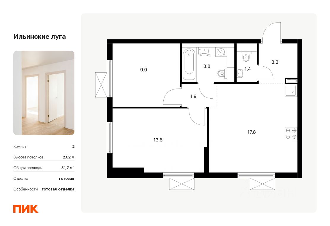 Продаётся 2-комн. квартира площадью 51,7 кв.м на 3 этаже 9 этажного дома (Корпус 2.8, Секция 6) проекта ПИК Ильинские луга. Светлый просторный подъезд на уровне земли, функциональная планировка, большие окна, c отделкой.