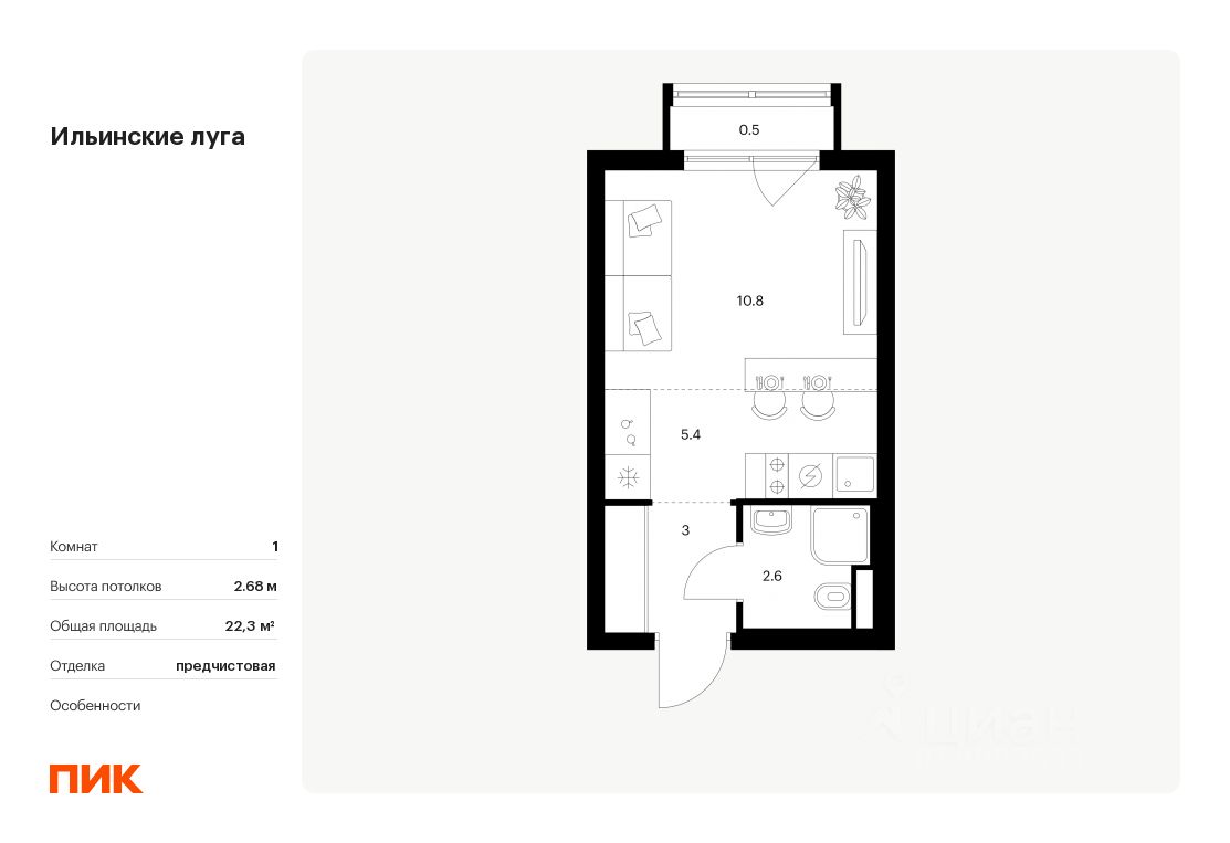 Продаётся квартира-студия площадью 22,3 кв.м на 6 этаже 9 этажного дома (Корпус 3.1, Секция 1) проекта ПИК Ильинские луга. Светлый просторный подъезд на уровне земли, функциональная планировка, большие окна, предчистовая отделка.
