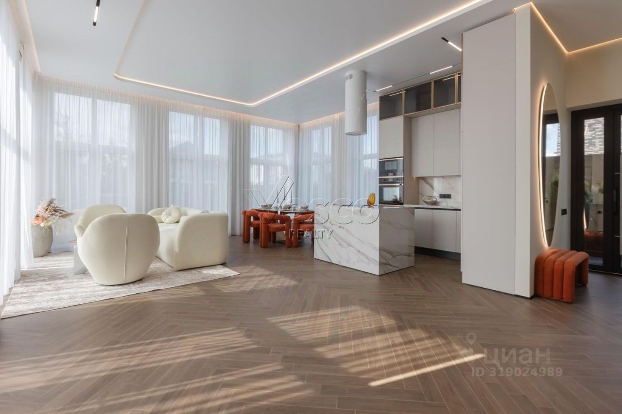 Стильный новый дом 250 кв.м с большой площадью остекления, модным интерьером и полной готовностью под тапочки для проживания семьи с детьми расположен в КП Николина Поляна, в 22 км от МКАД по Новорижскому / Ильинскому шоссе.