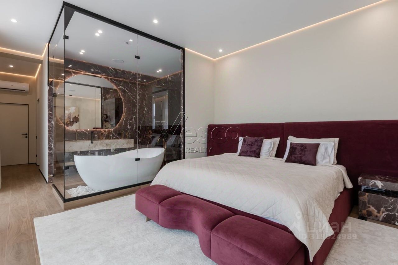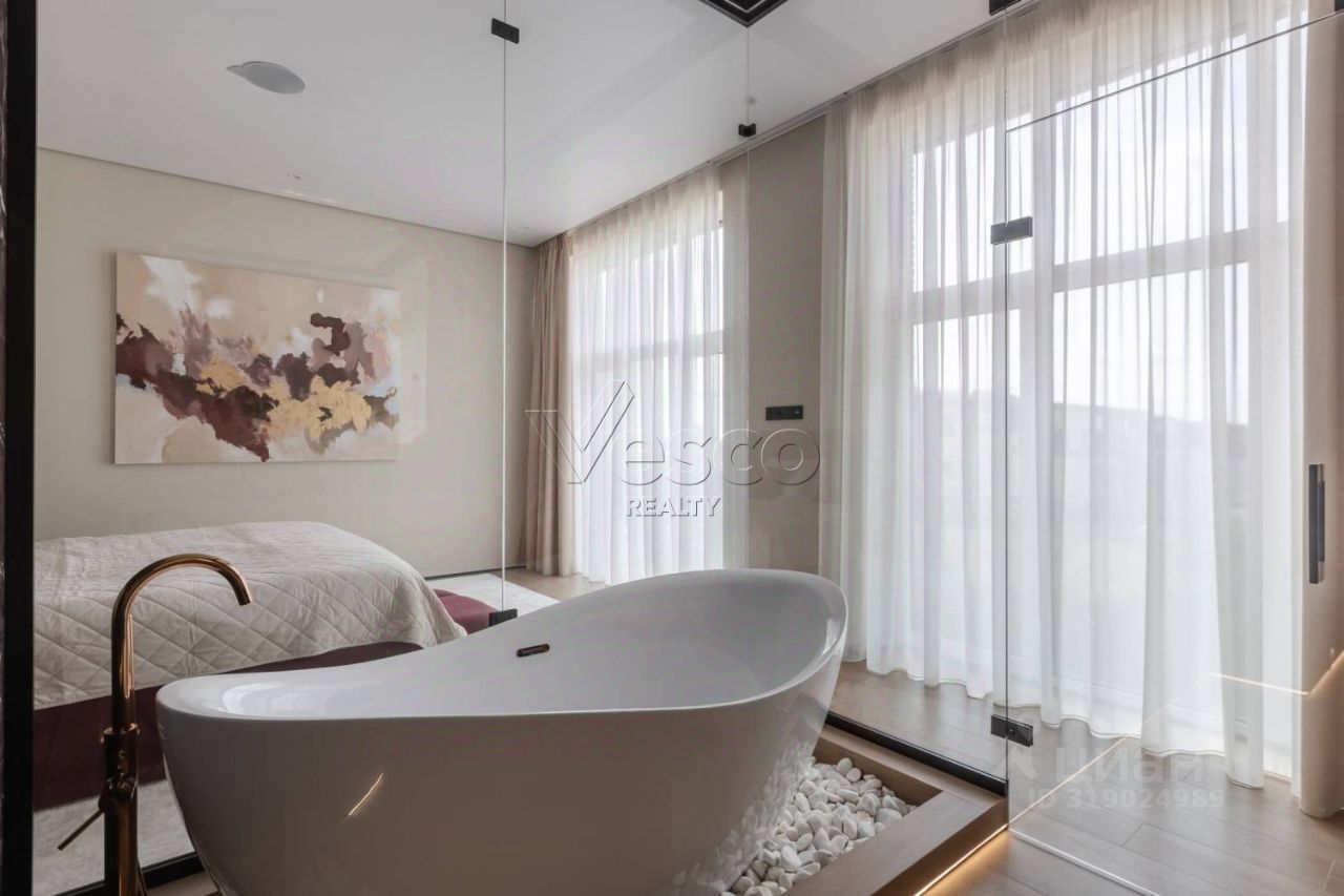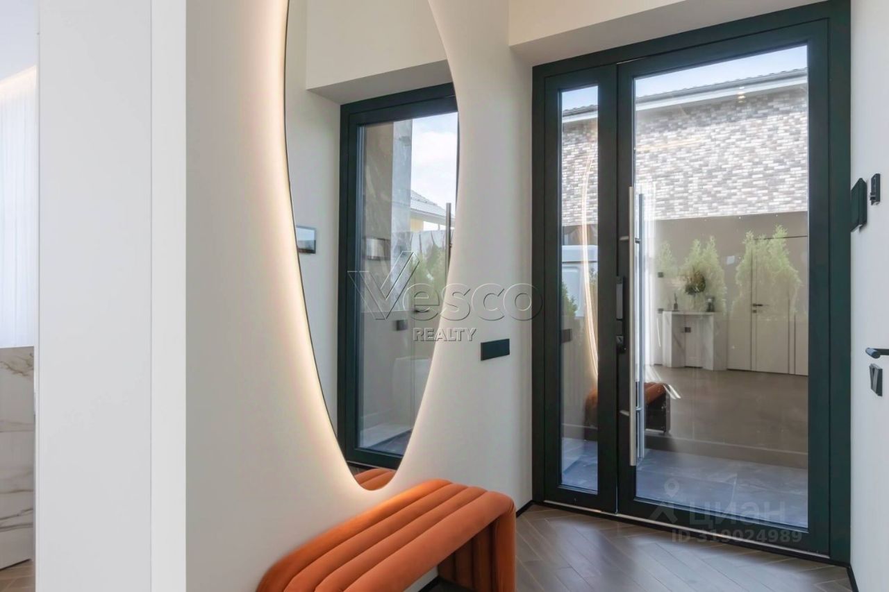 Преимущества: панорамные окна, модный интерьер, стильное решение - разделение ванной и спальни стеклянной перегородкой, дизайнерская напольная раковина в гостевом с/у, кухня с шикарным островом, по всему дому теплый пол, дизайнерские картины и скульптуры (в том числе - на участке, в человеческий рост), на террасе уличная мебель, в ванных комнатах брендированные банные принадлежности (полотенца, тапочки, халаты).