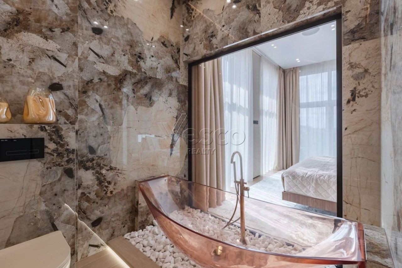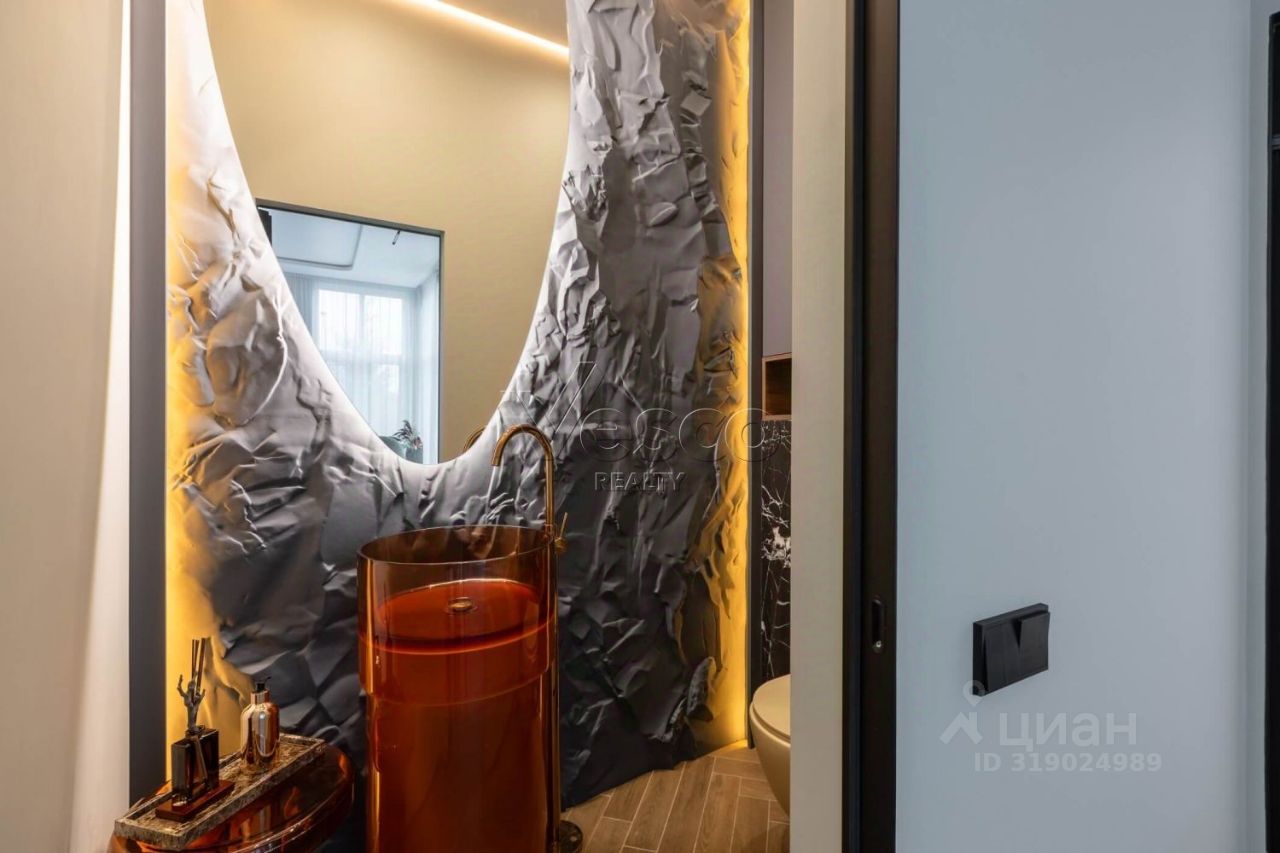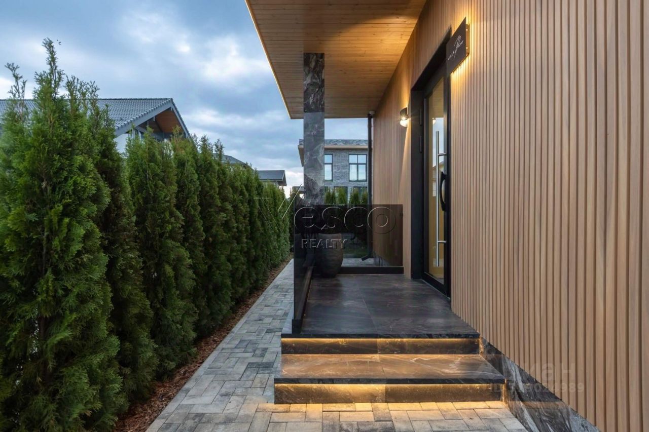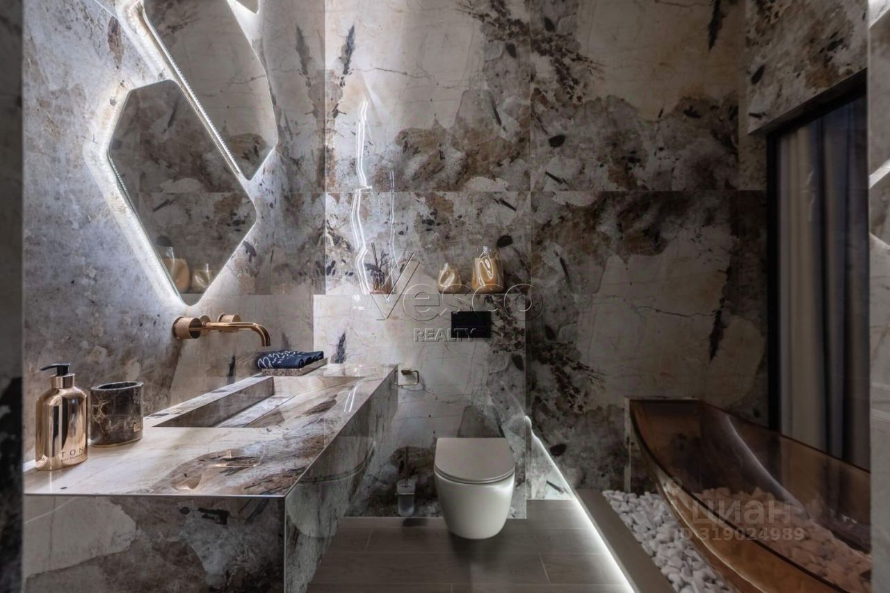 Преимущества: панорамные окна, модный интерьер, стильное решение - разделение ванной и спальни стеклянной перегородкой, дизайнерская напольная раковина в гостевом с/у, кухня с шикарным островом, по всему дому теплый пол, дизайнерские картины и скульптуры (в том числе - на участке, в человеческий рост), на террасе уличная мебель, в ванных комнатах брендированные банные принадлежности (полотенца, тапочки, халаты).