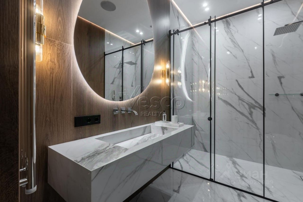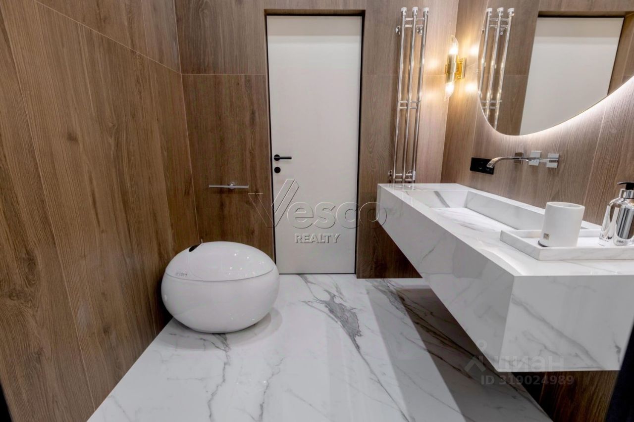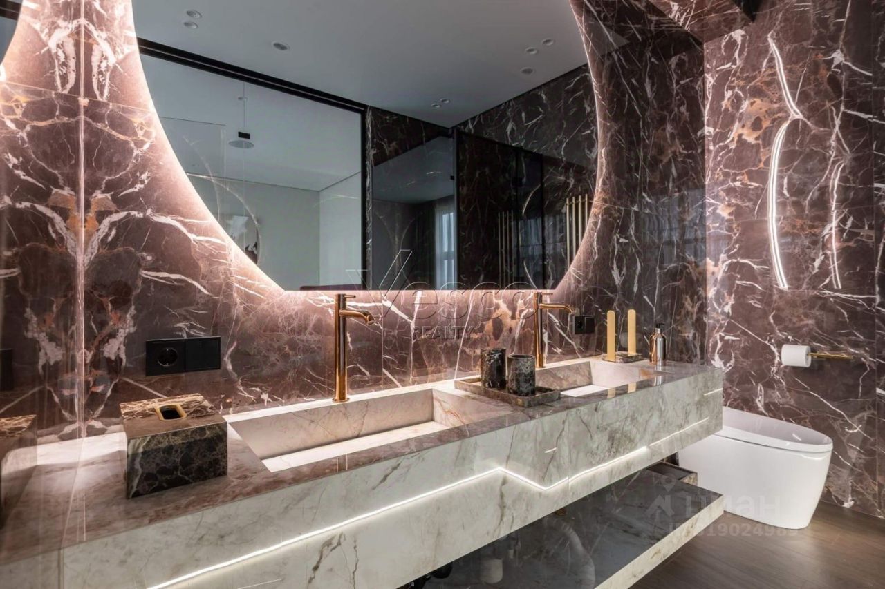 Сантехника и смесители: Grohe, Omoikiri, Abber. Установлено два умных унитаза Phillips. В ванных - крупноформатный керамогранит Kerama Marazzi.
