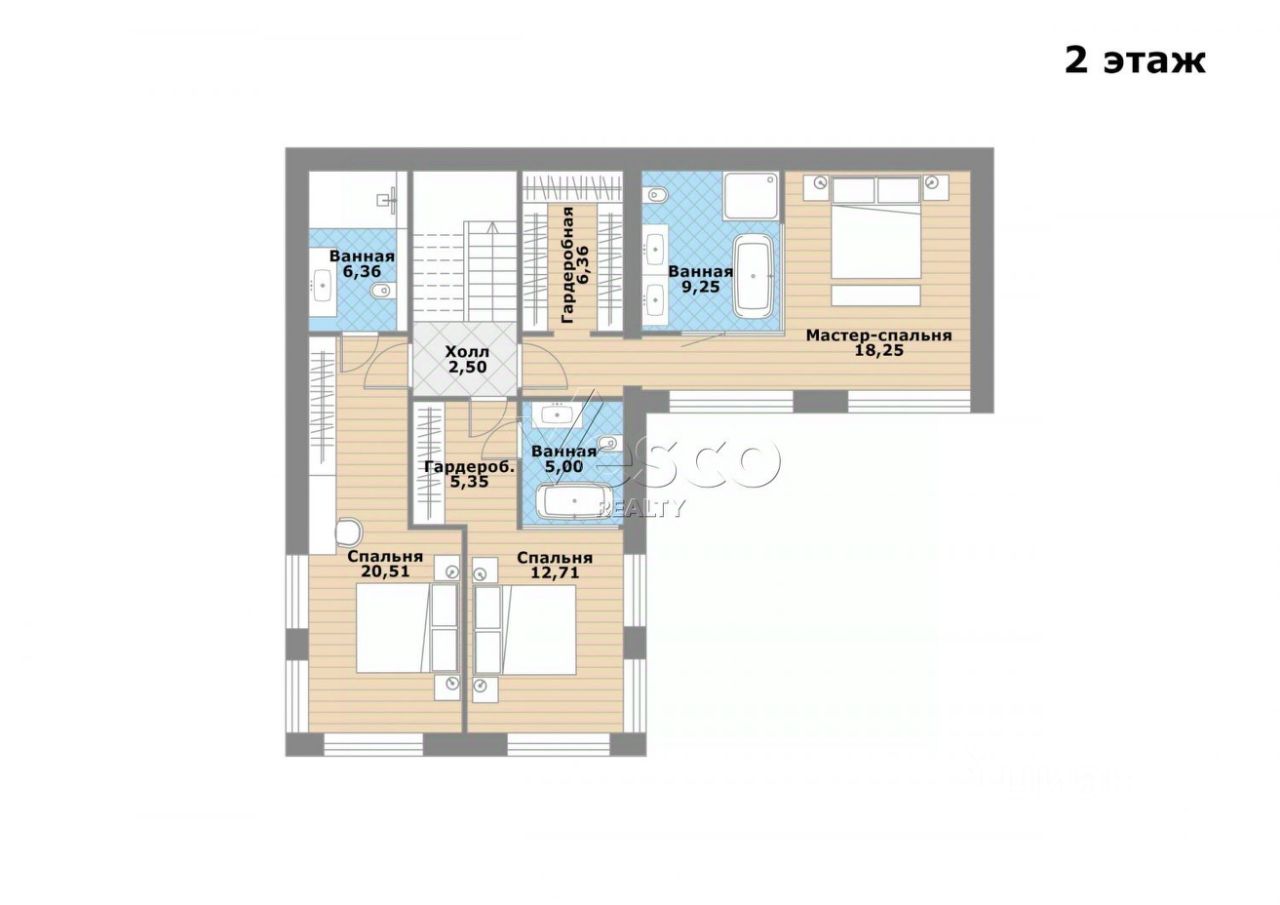 В доме: 4 спальни (одна их них - на первом этаже), просторная и светлая столовая-гостиная с выходом на большую террасу (50 кв.м), кухня с островом, вместительная гардеробная при входе, гостевой с/у, 4 ванные комнаты при спальнях, котельная с отдельным входом с улицы.