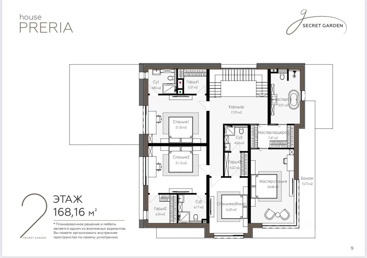 Площадь — 393 м² — 4 спальни, каждая с собственной ванной и гардеробной — мастер-спальня с балконом — просторная кухня-гостиная с выходом на террасу — потолки 3,6 м, панорамное остекление — гараж на два автомобиля