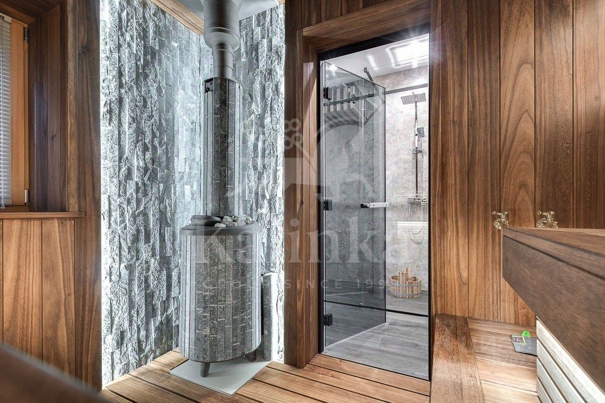Отделка дома выполнялась из высококачественных современных материалов, инженерные системы включают в себя: приточно-вытяжную вентиляцию с увлажнением и системой кондиционирования воздуха, электроприводы штор, мультирум и Wi-Fi, в доме установлены деревянные стеклопакеты, отделка фасада из натурального камня и лиственницы.