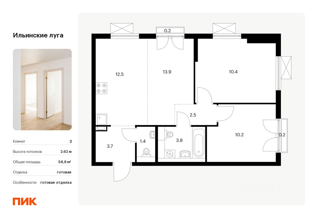 Продаётся 2-комн. квартира площадью 58,8 кв.м на 8 этаже 9 этажного дома (Корпус 2.8, Секция 3) проекта ПИК Ильинские луга. Светлый просторный подъезд на уровне земли, функциональная планировка, большие окна, c отделкой.