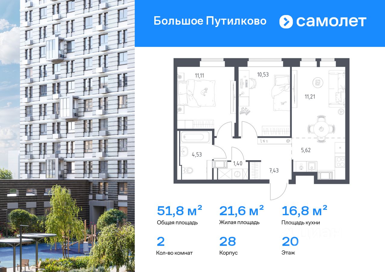 Предлагается 2-комнатная квартира комфорт-класса 51,83 кв.м в корпусе 28 на 20 этаже, в ЖК ''Большое Путилково'' Квартира с чистовой отделкой. Доступность дополнительных опций уточняйте у застройщика.