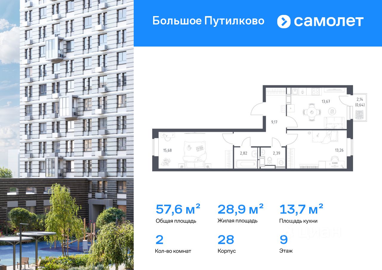 Предлагается 2-комнатная квартира комфорт-класса 57,63 кв.м в корпусе 28 на 9 этаже, в ЖК ''Большое Путилково'' Квартира без отделки. Доступность опции ''отделка'' и возможность комплектации мебелью и декором уточняйте у застройщика.