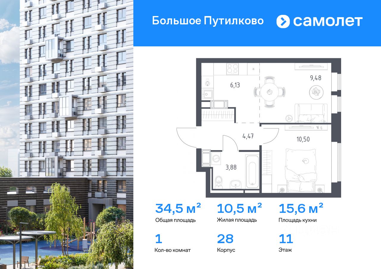 Предлагается 1-комнатная квартира комфорт-класса 34,46 кв.м в корпусе 28 на 11 этаже, в ЖК ''Большое Путилково'' Квартира с чистовой отделкой. Доступность дополнительных опций уточняйте у застройщика.