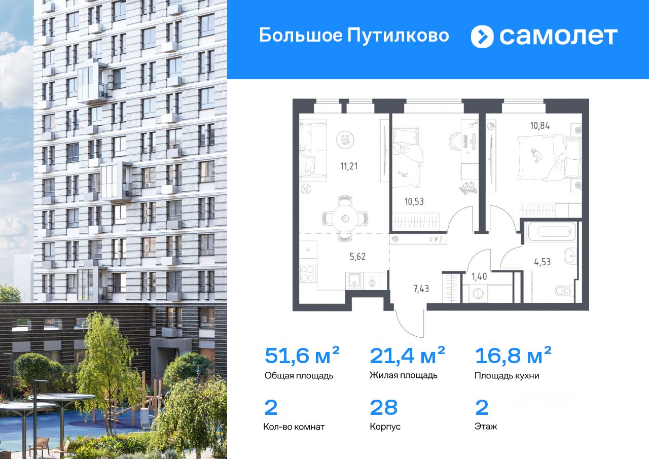 Предлагается 2-комнатная квартира комфорт-класса 51,56 кв.м в корпусе 28 на 2 этаже, в ЖК ''Большое Путилково'' Квартира без отделки. Доступность опции ''отделка'' и возможность комплектации мебелью и декором уточняйте у застройщика.